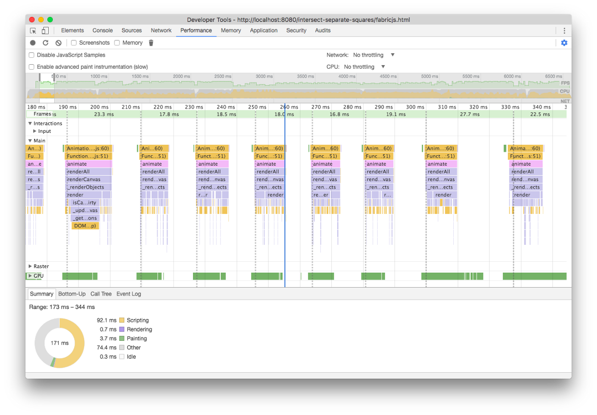 }; I started working with FabricJS this week so there’s a big chance things might break. I couldn’t find any place this might break after going through the canvas.renderAll method source code but this needs more tests before it can be used in any project. Here’s screenshots of profiles before and after applying the hack on an example scene.